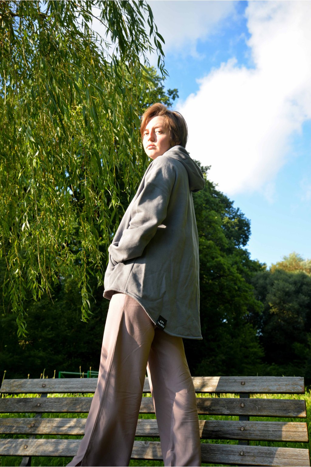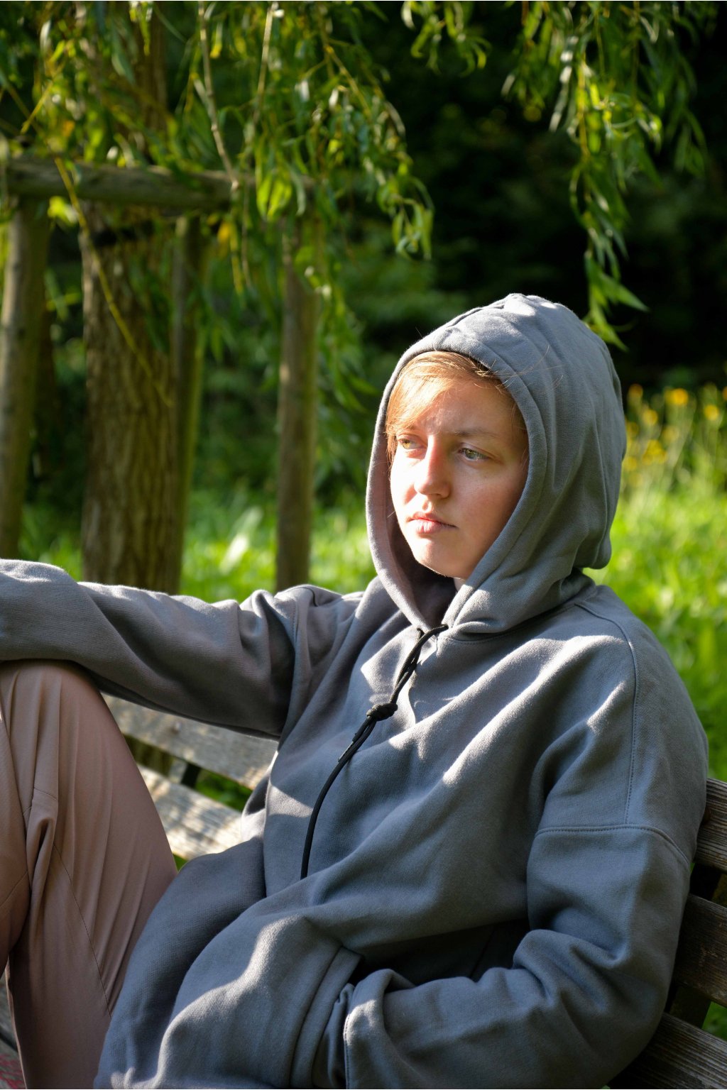 Adél je 168 cm vysoká a většinou nosí oblečení velikosti M. Mikinu na sobě má velikost M/L.